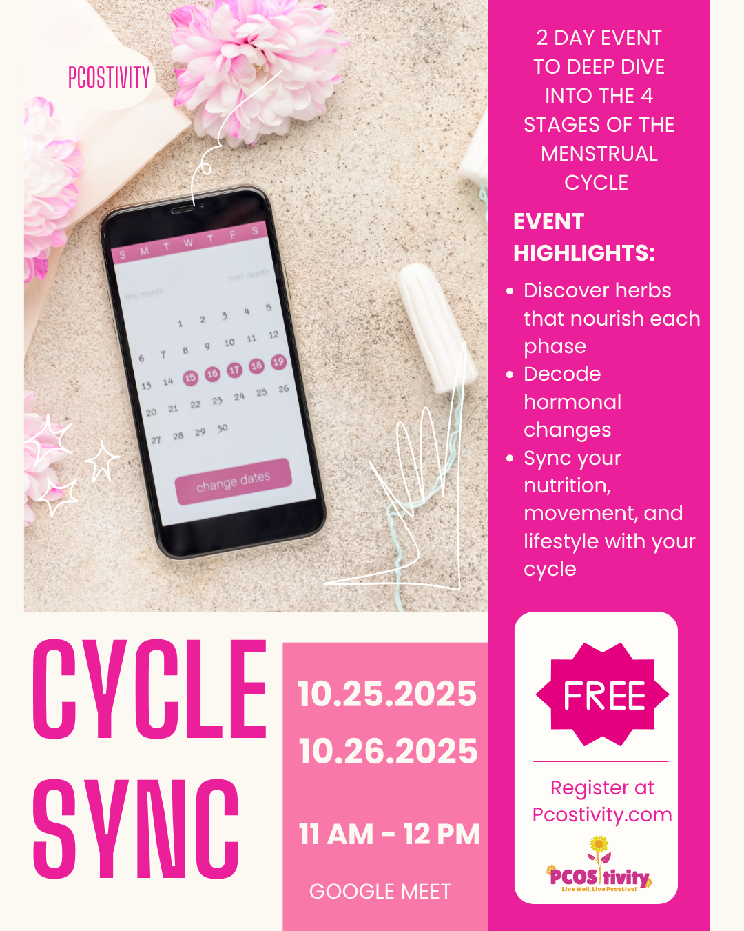 Join us for a transformative 2-day experience designed to help you deeply understand and align with your menstrual cycle. Cycle Sync will guide you through the four distinct phases menstrual, follicular, ovulatory, and luteal and teach you how to support each one with intention.